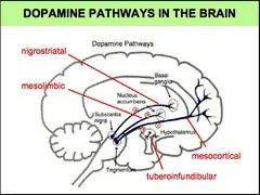 - MESOLIMBIC-projects from the dopaminergic cell bodies in the ventral tegmentum to the limbic system. This pathway is where the positive symptoms come from (hallucinations, delusions, and thought disorders). Problem here in a psychotic patient is there is too much dopamine.