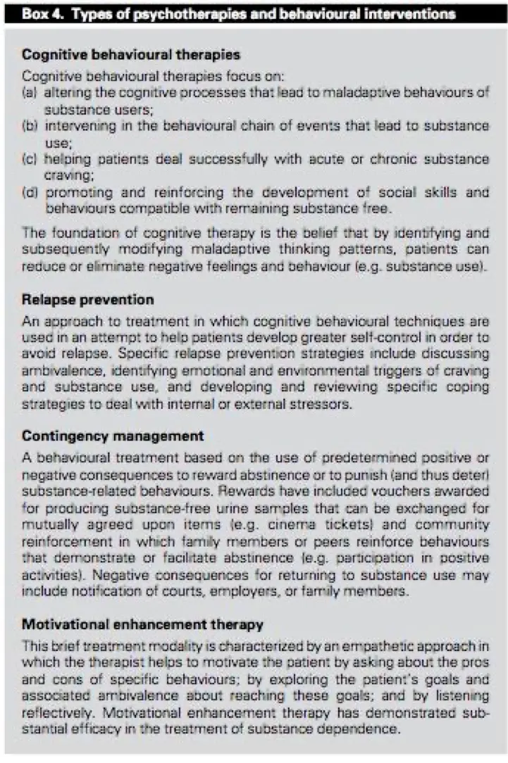- Focus on: a. altering the cognitive processes that lead to maladaptive behaviors of substance users; b. intervening in the behavioral chain of events that lead to substance use; c. helping patients deal successfully with acute or chronic substance craving; d. promoting and reinforcing the development of social skills and behaviors compatible with remaining substance-free.