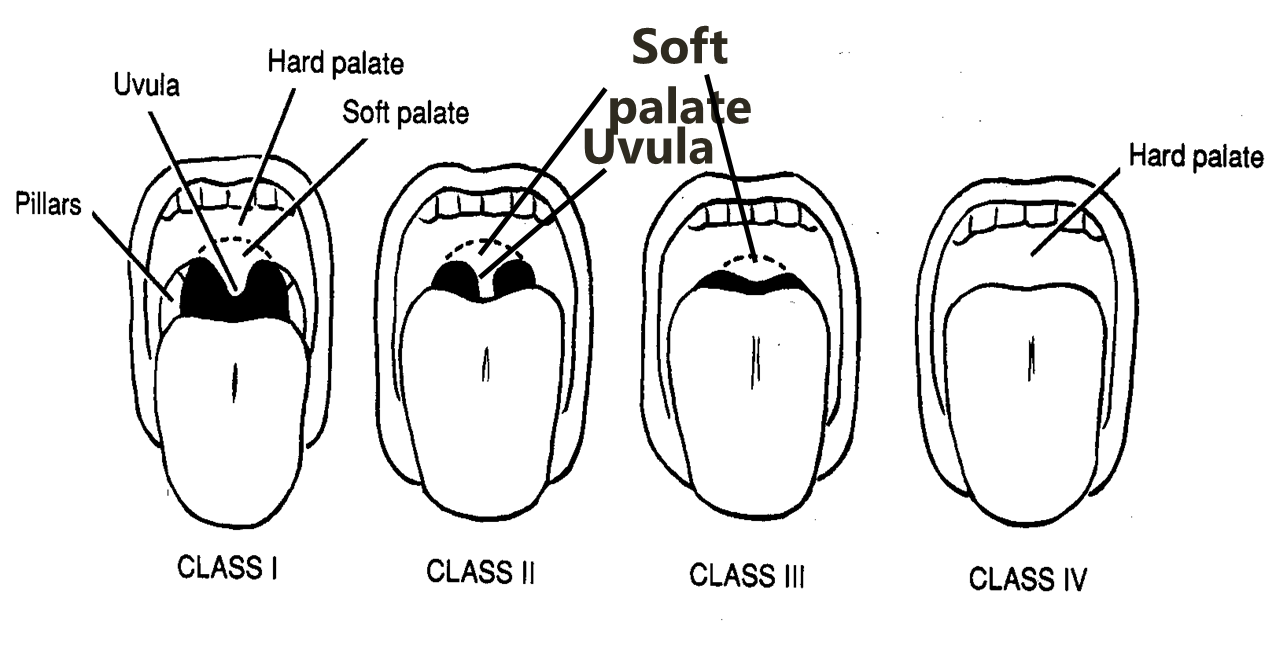 - Class I: Visualization of the soft palate, uvula, anterior and the posterior pillars.