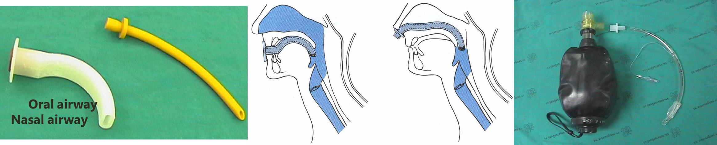 Airway. the oral airway is a device that lifts the tongue off the posterior pharynx, often making it easier to mask ventilate a patient. Also a source of O2 with a delivery mechanism (ambu-bag and mask) must be available.