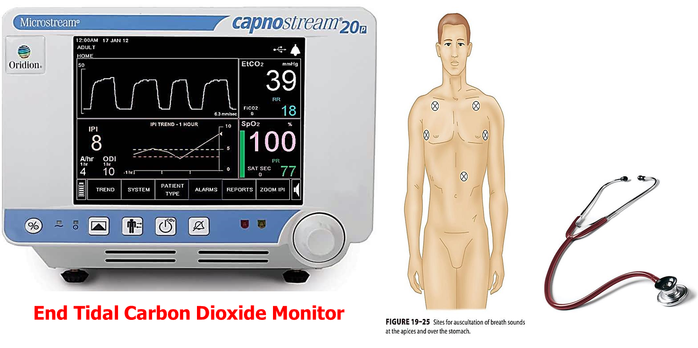 - Listens for breathing sounds to ensure correct placement of the tube (in stomach and chest)