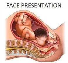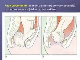 Face presentation: a. mento-anterior( delivery possible) b. mento-posterior (delivery impossible).