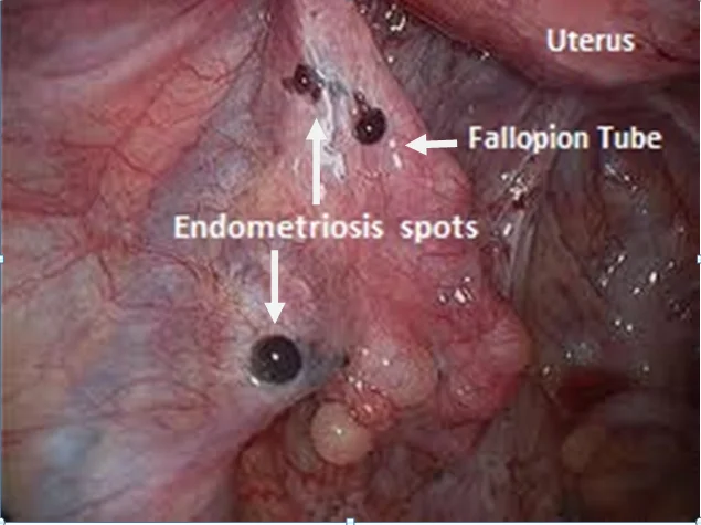 A 32-year-old G0P0 presents to the infertility clinic with a 3-year history of infertility. She states that her menses began at age 13 and occurs on regular 28-day intervals. She complains of severe monthly pain 1 week before each menses and pain with intercourse. She denies a history of sexually transmitted diseases. Her husband has a child from a previous marriage. On rectovaginal exam, she has uterosacral nodularity and a fixed, retroflexed uterus.