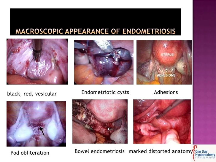 - Diagnostic laparoscopy (gold standard) a marked discrepancy in appearance of the endometriotic lesions: a. classically appear as blue-black powder-burn. b. Nonclassic lesions may appear vesicular, red, white, tan, or nonpigmented. The presence of defects in the peritoneum (usually scarring overlying endometrial implants) is known as Allen-Masters syndrome. c. Endometriomas, “chocolate cysts,” appear filled with dark brown blood.