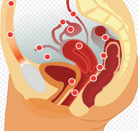 - Pelvic pain (that is especially worse during menses, but can be chronic): * Secondary dysmenorrhea (pain begins up to 48 hr prior to menses). * Dyspareunia (painful intercourse) as a result of implants on pouch of Douglas; occurs commonly, with deep penetration. * Dyschezia (pain with defecation): Implants on rectosigmoid. * Dysuria: implant in urinary system. * Infertility. Z