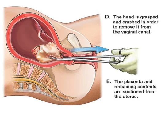 D. The head is grasped and crushed in order to remove it from the vaginal canal.