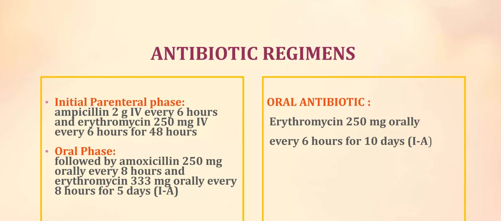 - Ampicillin 2 g IV every 6 hours and erythromycin 250 mg IV every 6 hours for 48 hours
