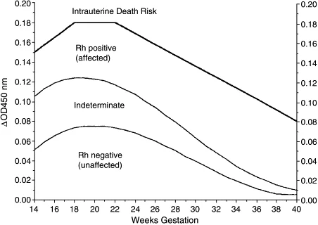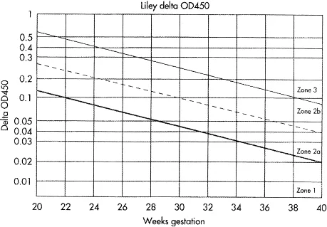 • A curve that reaches to or beyond the 80th percentile of zone II on the Liley graph or enters the “intrauterine transfusion” zone of the Queenan curve necessitates investigation by fetal blood sampling.