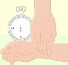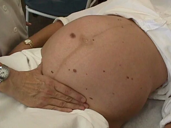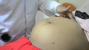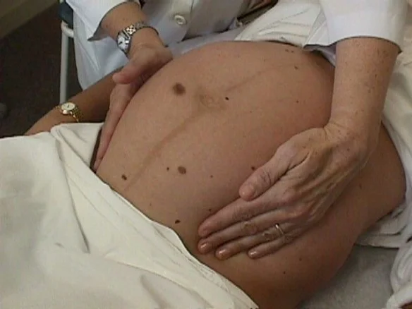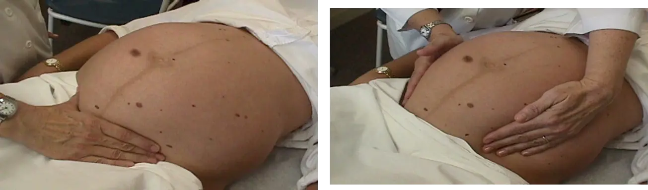 Keep the ulnar border of the curved left hand on the woman’s abdomen parallel to the symphysis pubis.