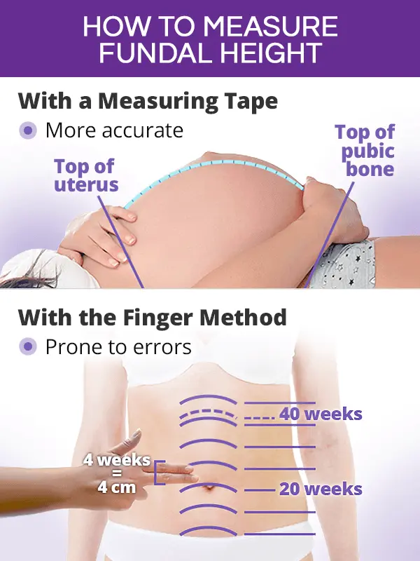 The fundal height is measured in centimeters (cm) from the upper edge of the pubic bone to the top of the uterus (the fundus). After about 20 weeks of pregnancy the measurement generally correlates with the gestational age in weeks, with a typical variance of ± 2 cm.