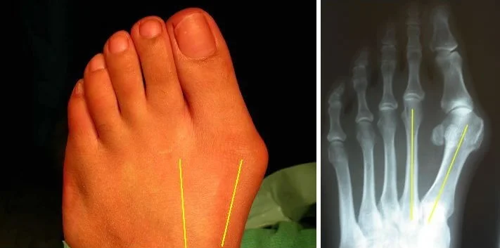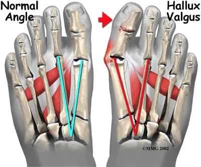 - Definition: lateral deviation of the great toe (hallux) and medial deviation of the first metatarsal