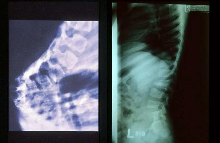 Causing erosion and destruction and finally anterior wedging of the vertebrae