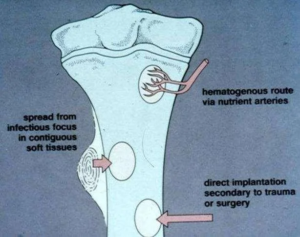 - Contiguous-focus: Associated with trauma, cellulitis, or poor vascularity