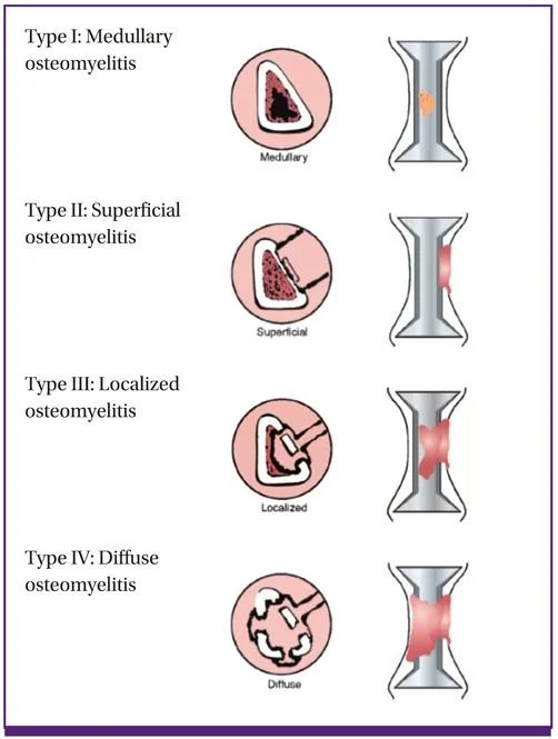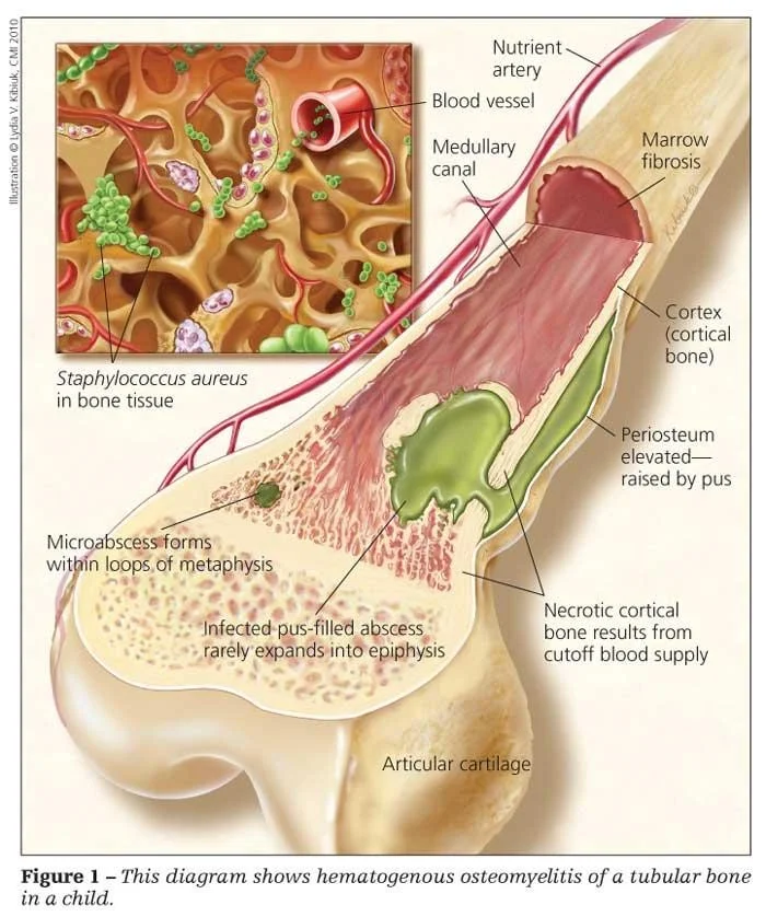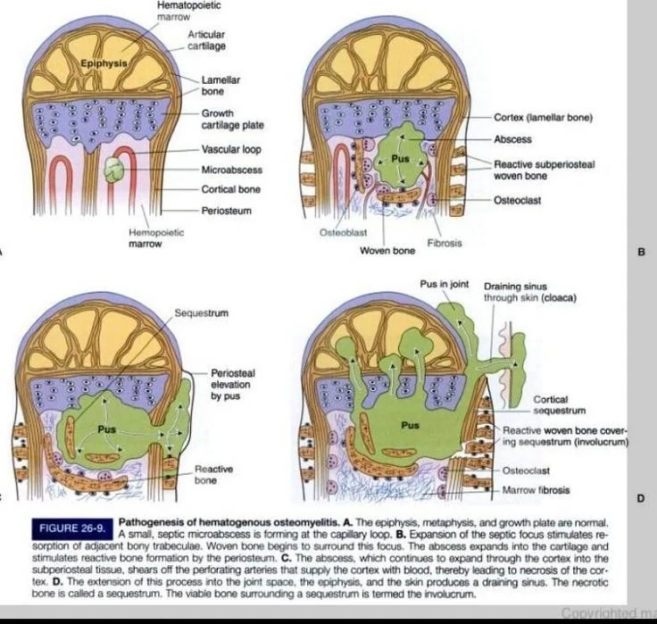 - Cavities and sequestra (bacteria adheres to dead bone and escapes the antibiotic effect)