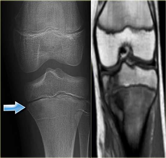 Compare X-ray and MRI in this case of acute osteomyelitis.