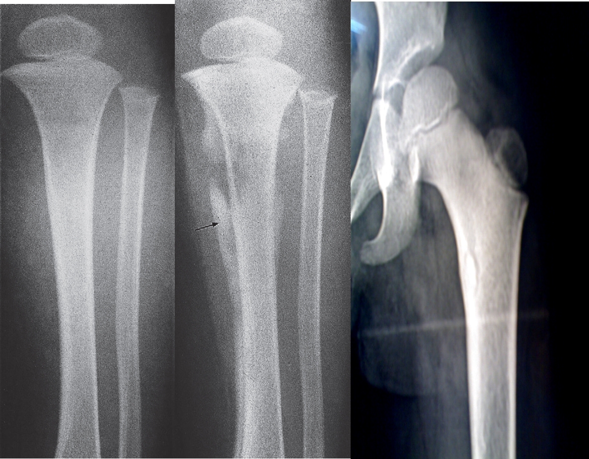 (C) Bony sequestrum X-ray leg (left; AP view) of a child A fragment of bone has separated from adjacent bone and is surrounded by a lucent rim. chronic osteomyelitis.Â