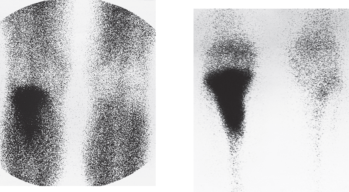(a) Scan taken 1 minute after injection of radionuclide showing increased uptake in the upper part of the leg.