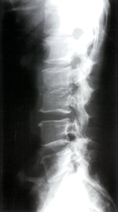 The inferior endplate of L2 and superior endplate of L3 are osteopenic and the cortices appear fragmented. The intervening L2–3 disc space is narrowed.
