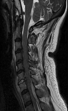 Spinal epidural abscess, osteomyelitis, and discitis MRI cervical spine (T2-weighted; sagittal plane) High signal intensity collections are seen in the posterior epidural space. The largest collection causes anterior displacement and compression of the spinal cord from C7-T2. The appearance is consistent with epidural abscess. High signal intensity consistent with osteomyelitis and discitis involves the C6 and C7