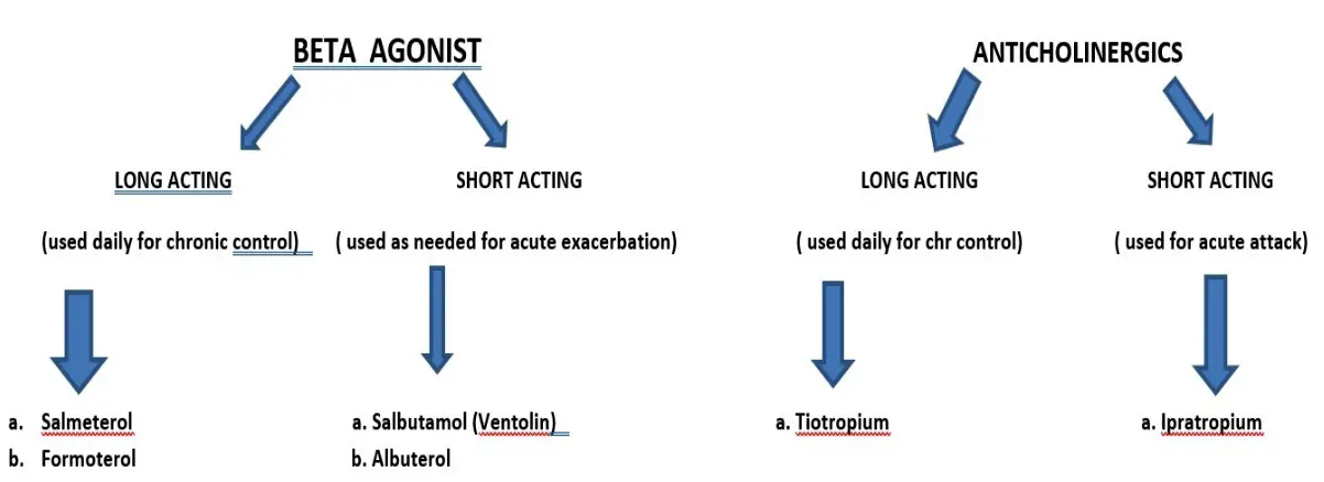 - Short-acting bronchodilators are used for acute exacerbations (they have a quick onset of action), while long-acting agents are used daily for chronic treatment.