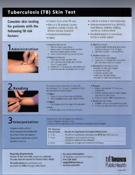 - Positive TSTs AND suspect/confirmed TB cases must be reported to Toronto Public Health.