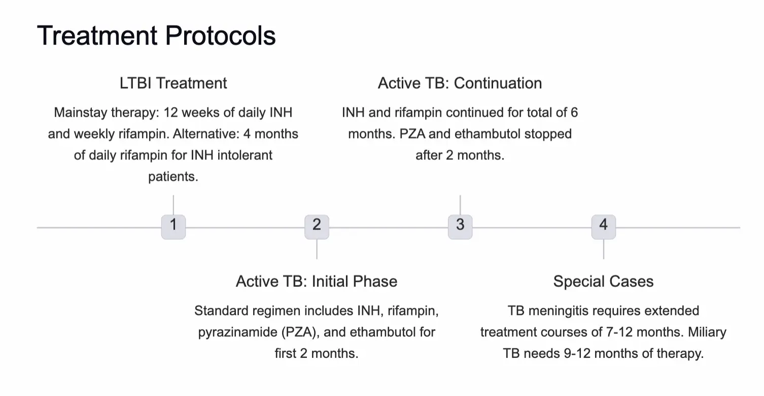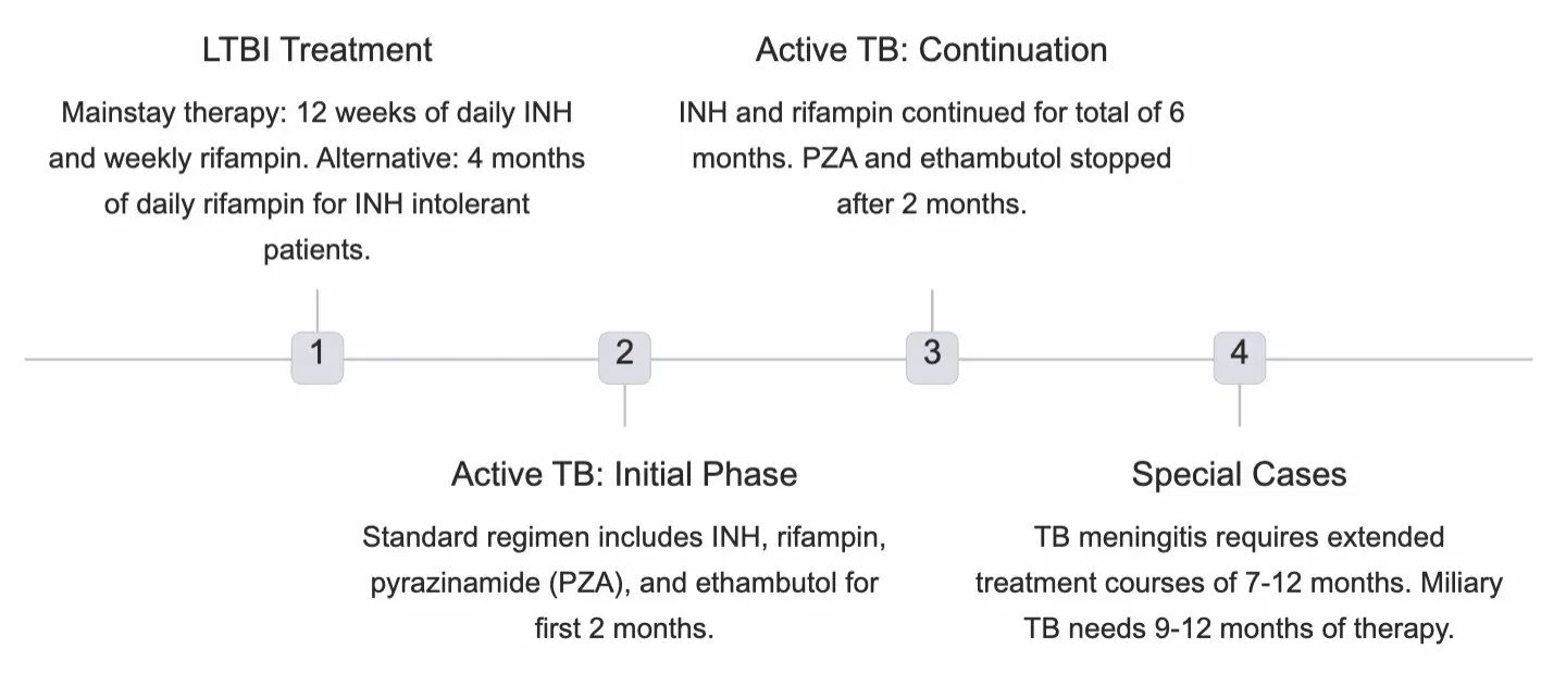 - Continuation Phase (4 Months): INH + Rifampin (Total duration 6 months).