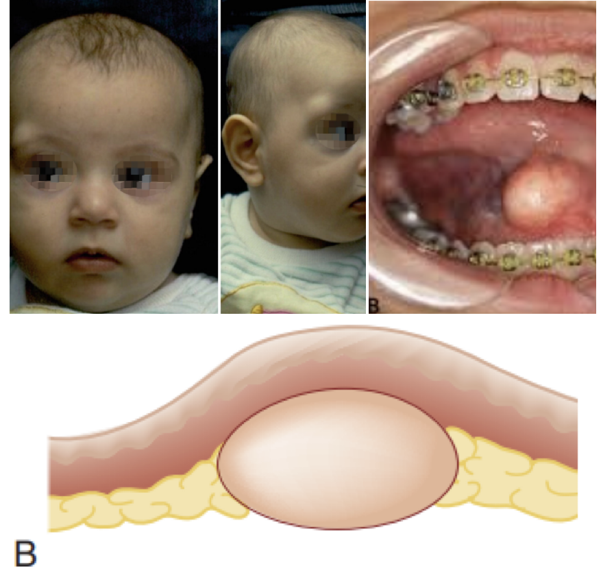 Symptoms: Child with slowly growing painless swelling in mid-line either sub-lingual or suprasternal.