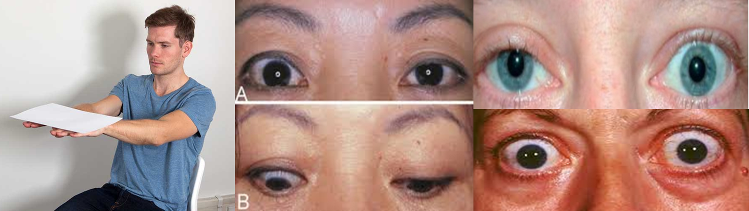 - Then fix patient head & move your finger to detect lid lag, lack of wrinkling on looking upwards& lack of convergence.
