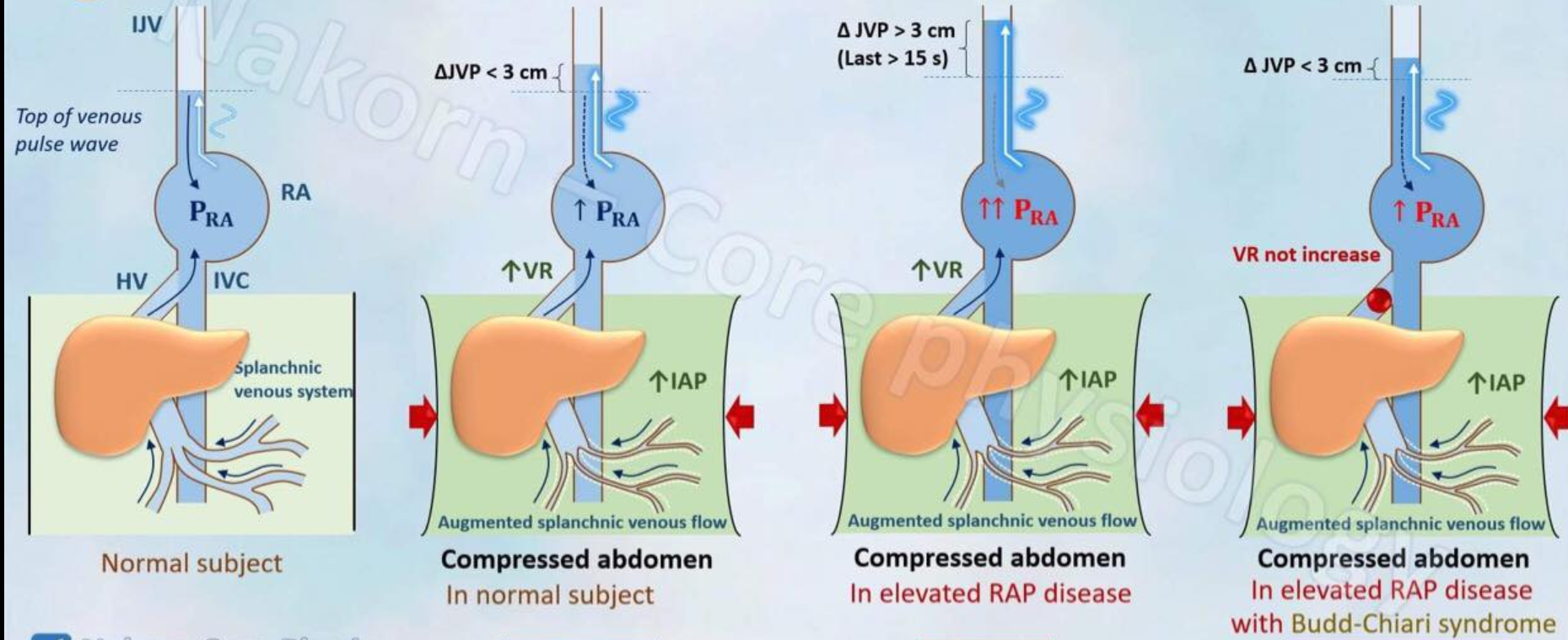 Watch the jugular vein as you apply pressure. A positive test is indicated by a sustained rise in the JVP of more than 3 cm that persists as long as pressure is applied and then quickly returns to normal when the pressure is released.