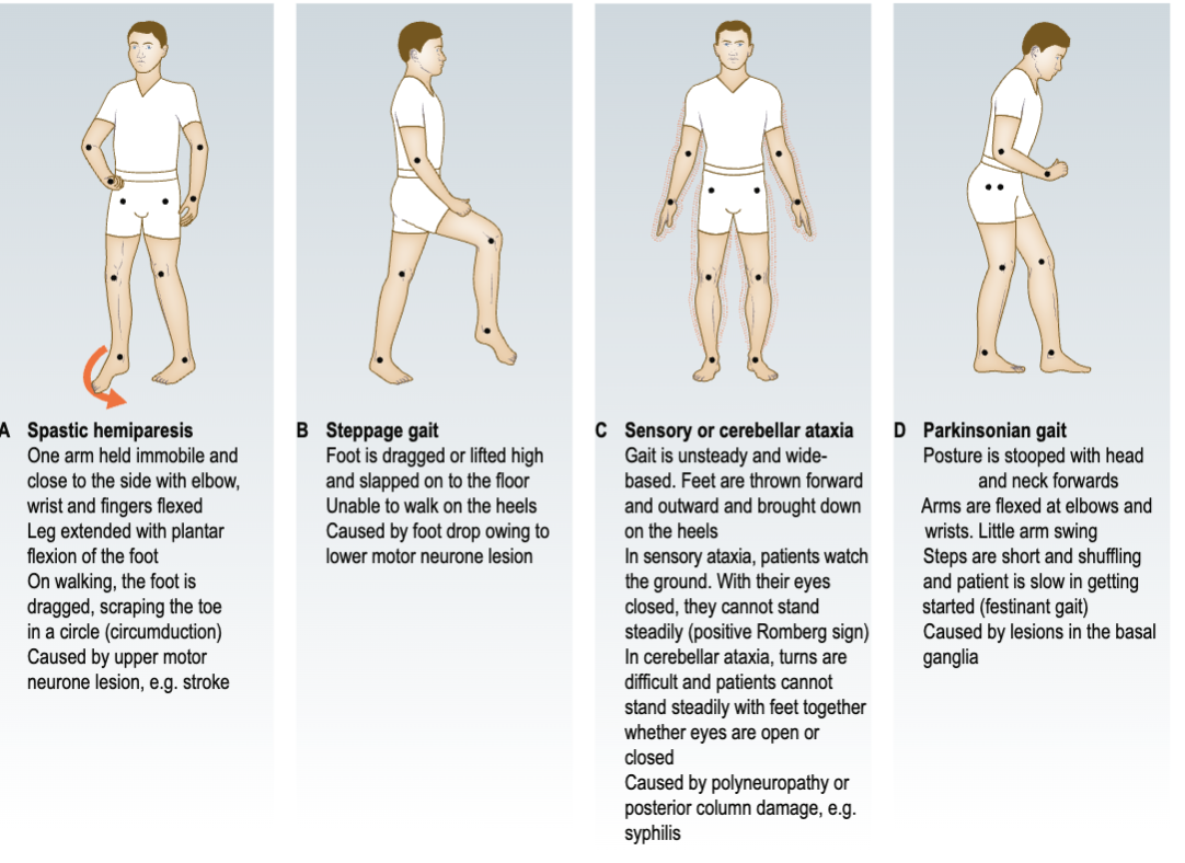 - Ataxic gait; lacks coordination, “reeling” with instability, Usually indicates cerebellar disease, loss of position sense or intoxication