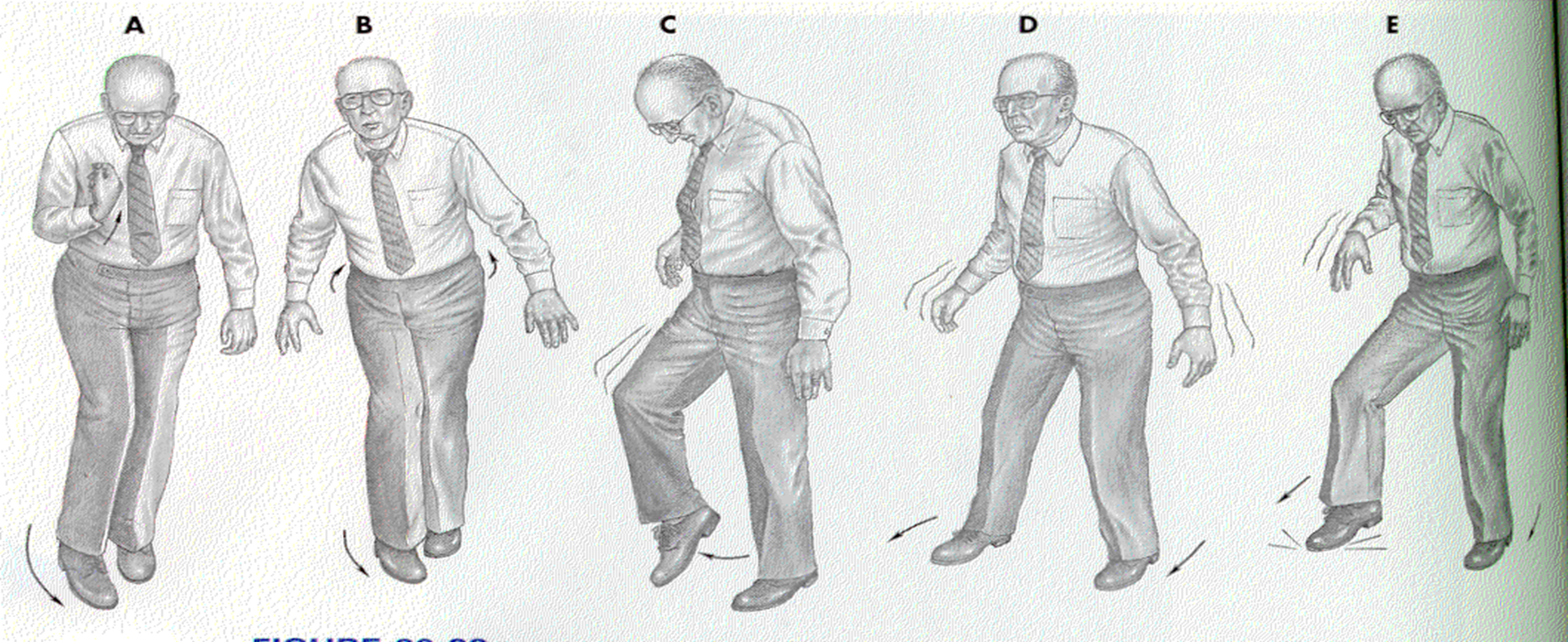 D = Cerebellar ataxia - the aptient’s feet are wide-based and there is staggering and lurching from side-to-side - often accompanied by swaying of the trunk.