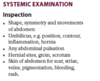 - Is it distended, asymmetrical, are there masses, scars, visible peristalsis,