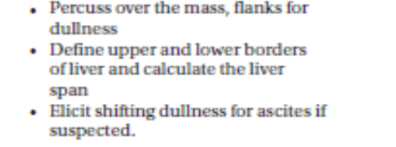 Lower border: In the midclavicular line begin percussion below the unbillicus and proceed upward until dullness is encounter.