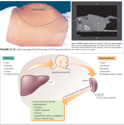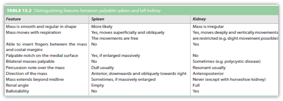 Examine the spleen Is the spleen enlarged? Is it palpable below the left costal margin? Begin in right iliac fossa and palpate towards left costal margin. Measure. Define the upper extent by percussion. Is it tender? Bruit?