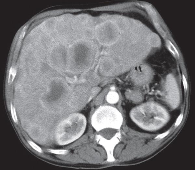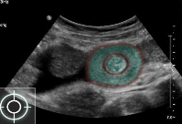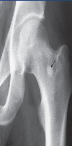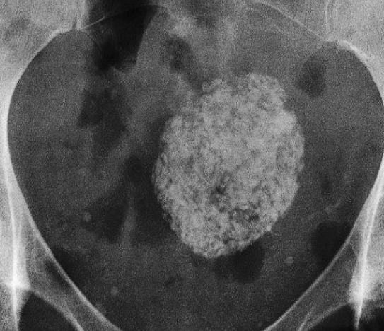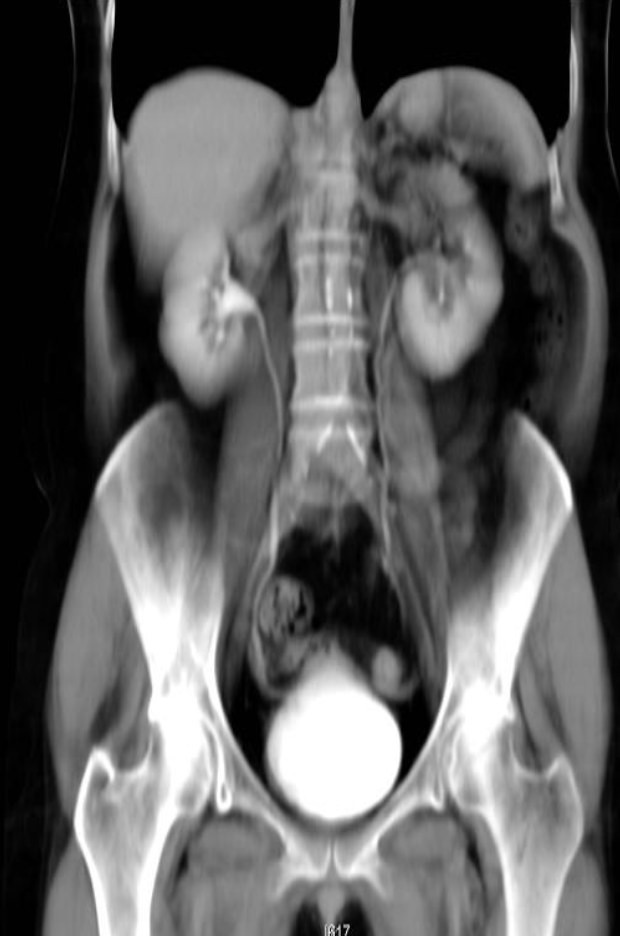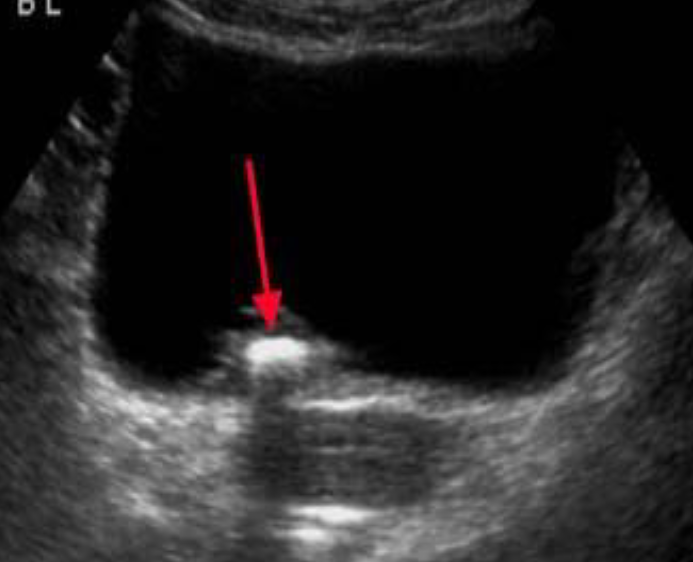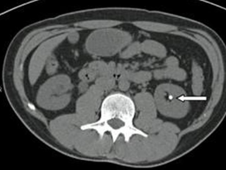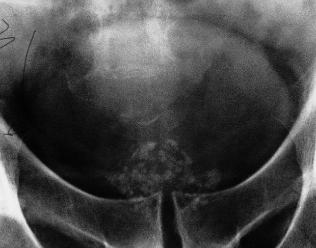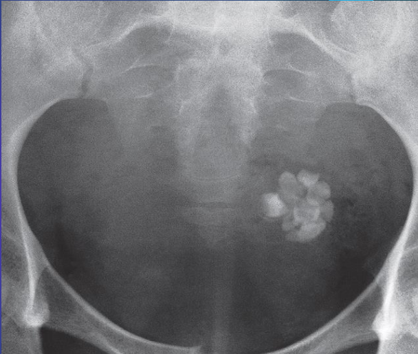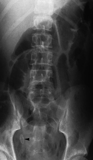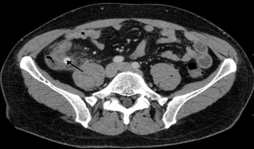 Findings or description The oval calcified shadow (arrowhead) is a faecolith in the appendix.