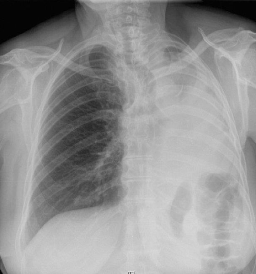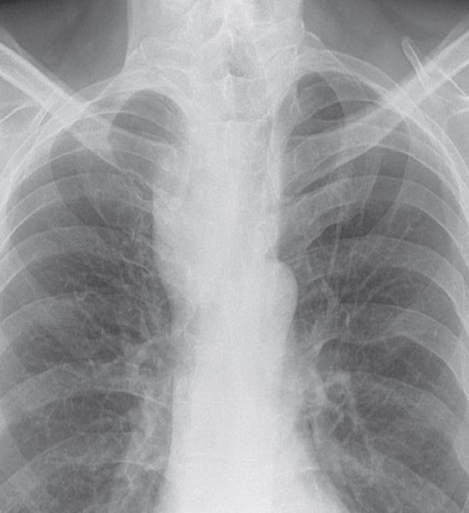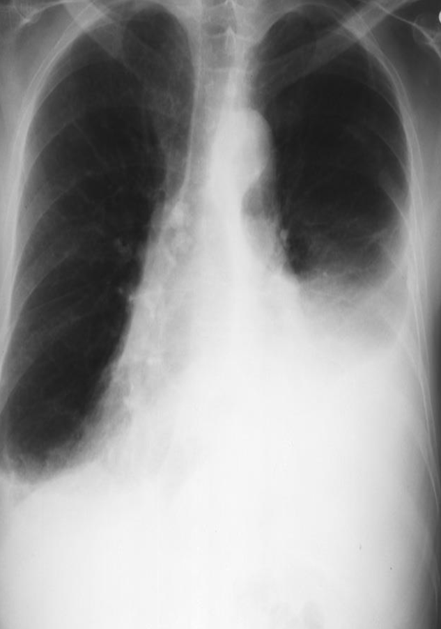 XR showing a large, right- sided, superior mediastinal mass displacing the trachea