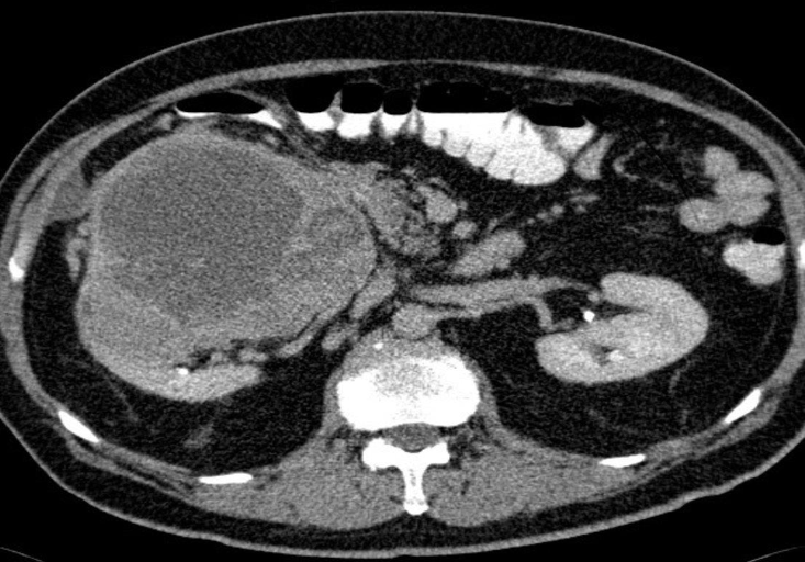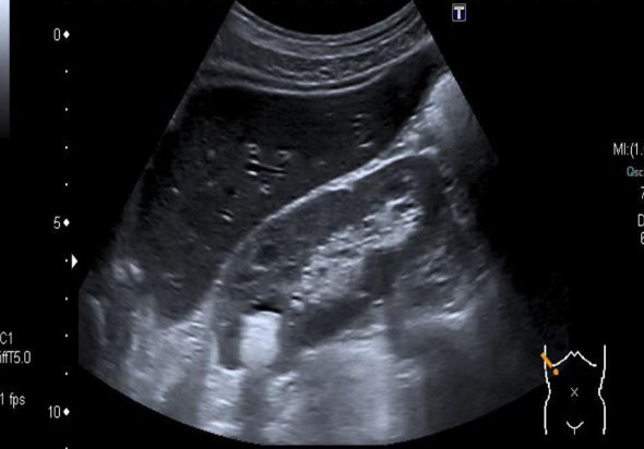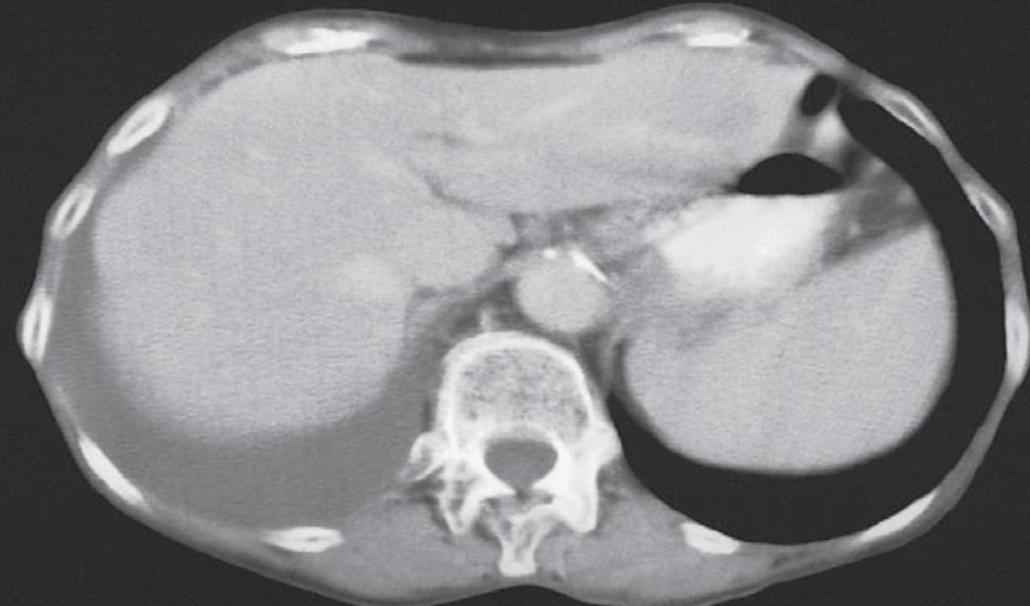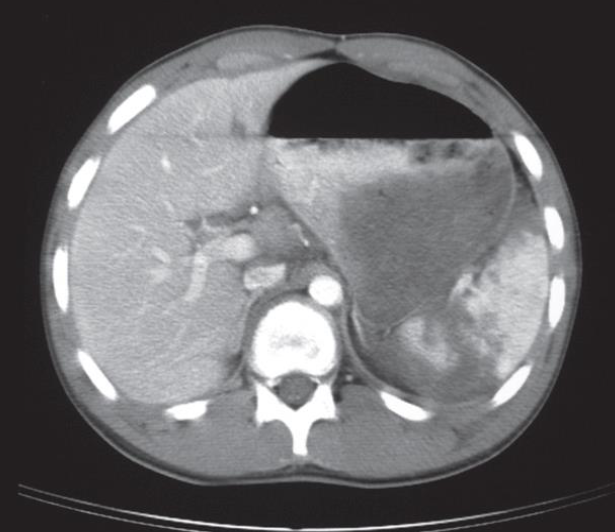 B. What abnormality is demonstrated in the given image? Ruptured spleen- The spleen is shattered with low density blood adjacent to the fragments.