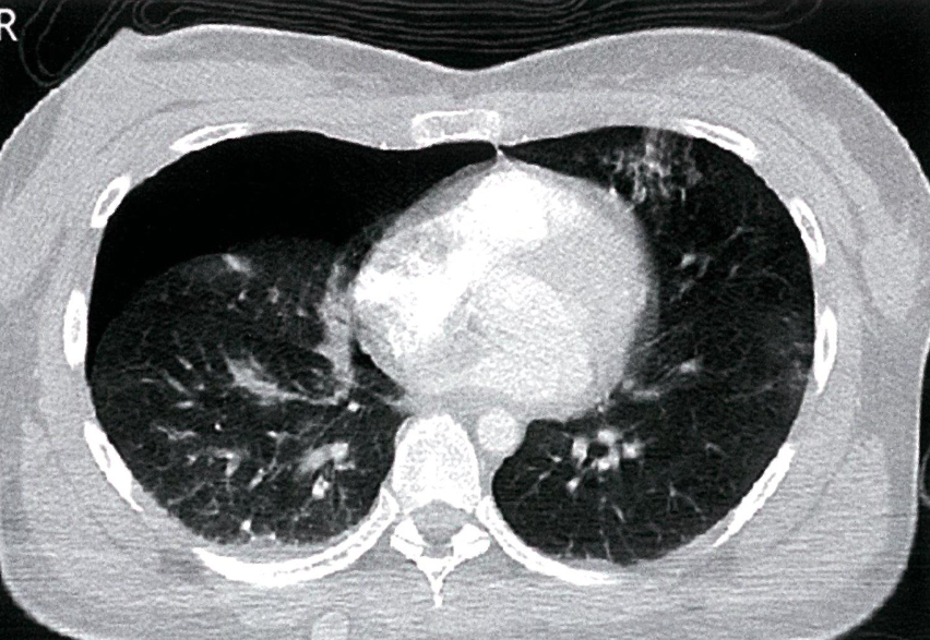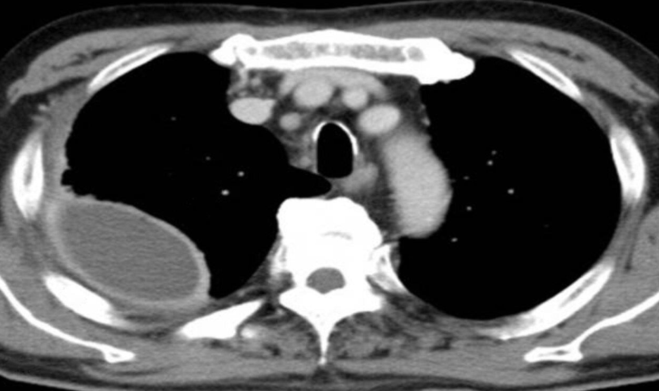 T scans show right-sided pleural fluid collections (PC). Each collection has a lenticular (biconvex) shape and is accompanied