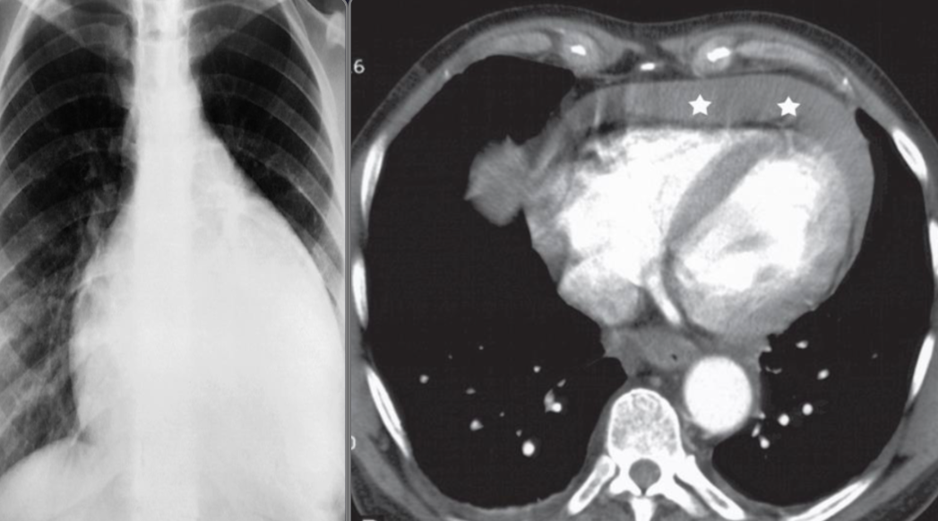 B. Findings or description Cardiomegaly, globular shape, fluid collection around heart