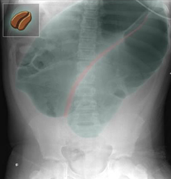 What is the name of Sign & what does it usually mean? Markedly dilated bowel . The configuration, including the double wall thickness of the two apposed bowel loops, resembles a bean “coffee bean sign”.
