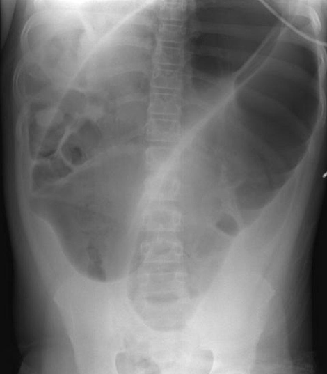 Sign Note the dilated loops of small bowel in the centre of the abdomen due to peritonitis – the so-called sentinel loops