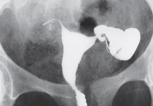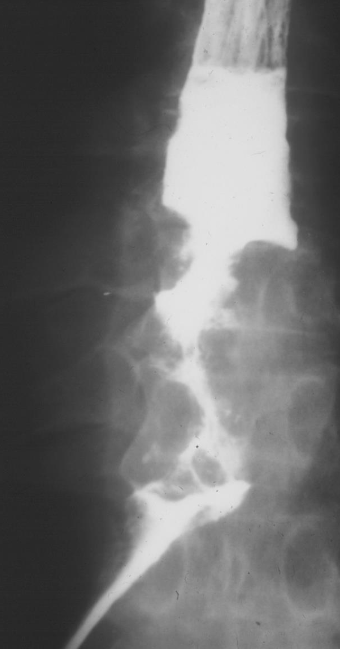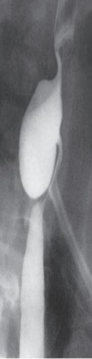 Barium swallow Pharyngeal pouch (Zenker’s diverticulum). The pouch lies behind the oesophagus, which is displaced forward