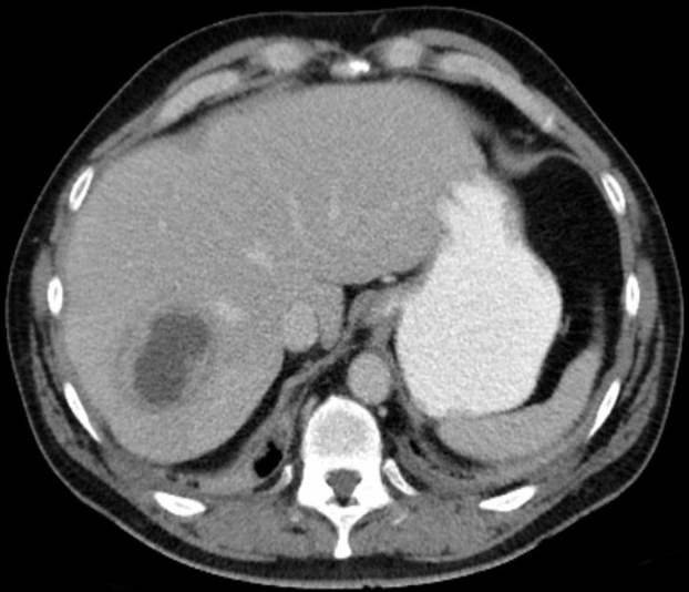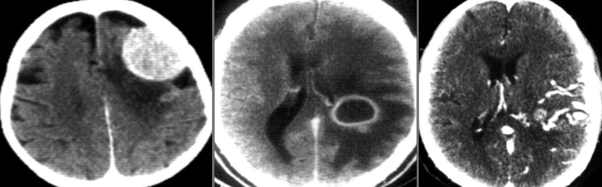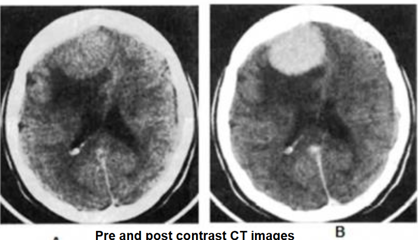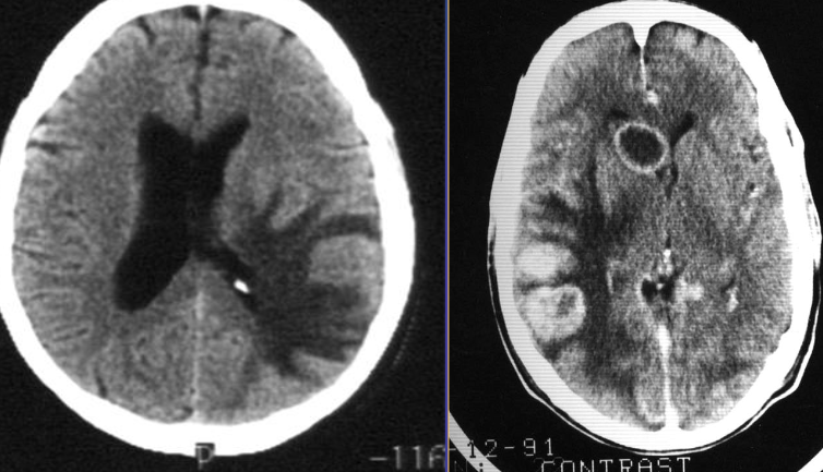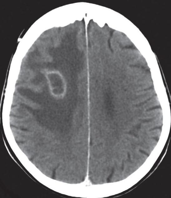 . (a) Post contrast CT scan showing a right frontal low density ring-enhancing lesion with surrounding vasogenic oedema
