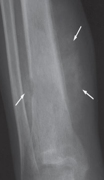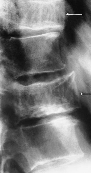 Increased density and coarse trabeculae in the wider than the normal vertebral bodies (arrows)