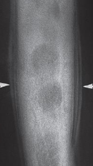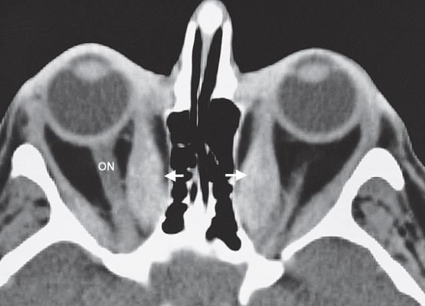 - showing enlargement of the extraocular muscles, particularly the medial rectus (arrows).