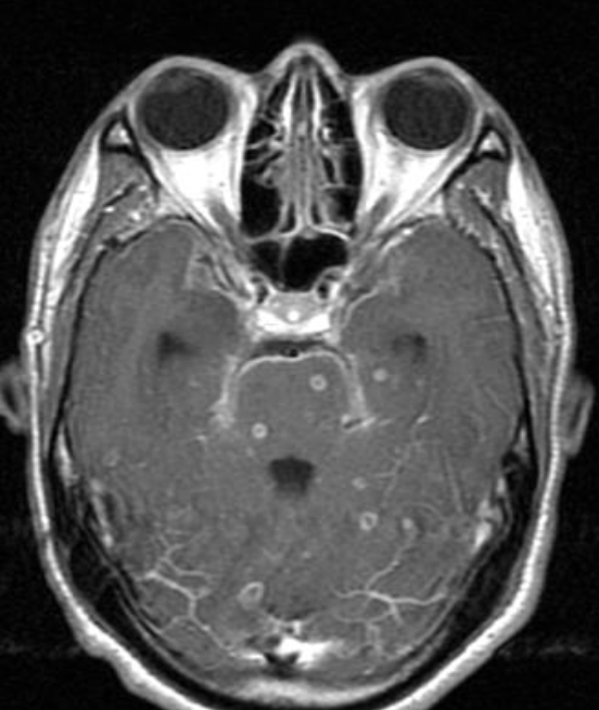 B. Give ONE cause for the pattern of contrast enhancement shown in the given image Tuberculomas ++ Chronic cough / Pulmonary TB