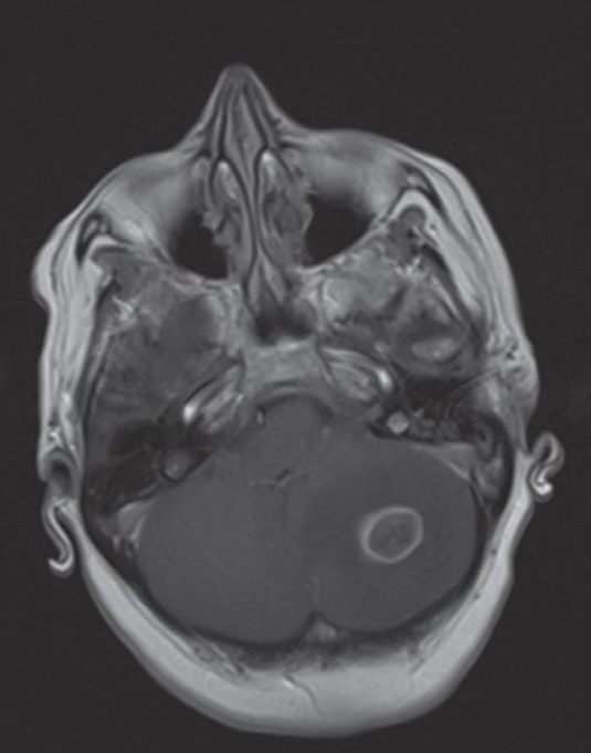 B. Give ONE cause for the pattern of contrast enhancement shown in the given image Cerebral abscess