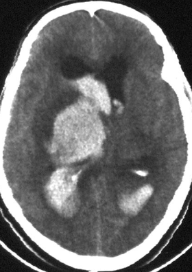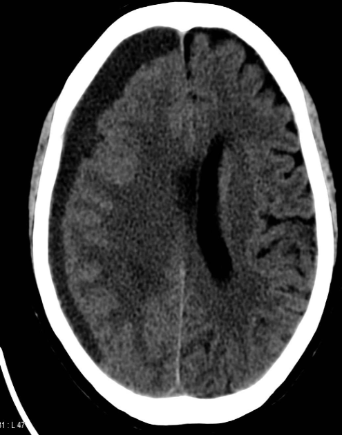 - Multiple areas of high attenuation in the basal cisterns, Sylvian fissures, and sulci are