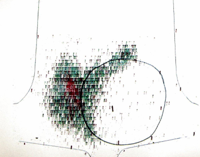 by thickening of the adjacent parietal (red line) and visceral pleurae (green line).