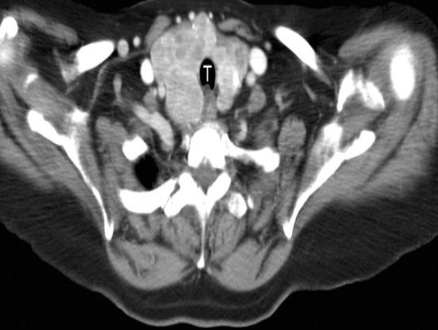 CT Multinodular goitre The enlarged thyroid enhances avidly after intravenous contrast showing many nodules of varying size.